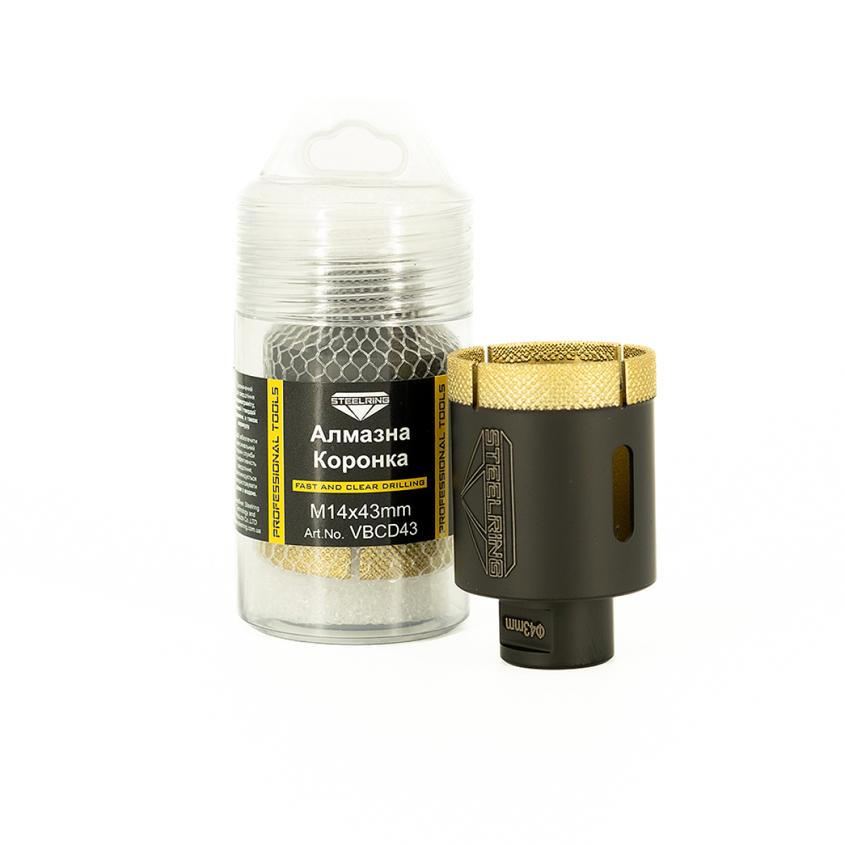 Алмазна коронка STEELRING 43 мм M14 (VBCD43) — це інструмент преміального класу, створений для максимально точного свердління керамічної плитки, керамограніту, мармуру та м’якої/твердої кераміки.