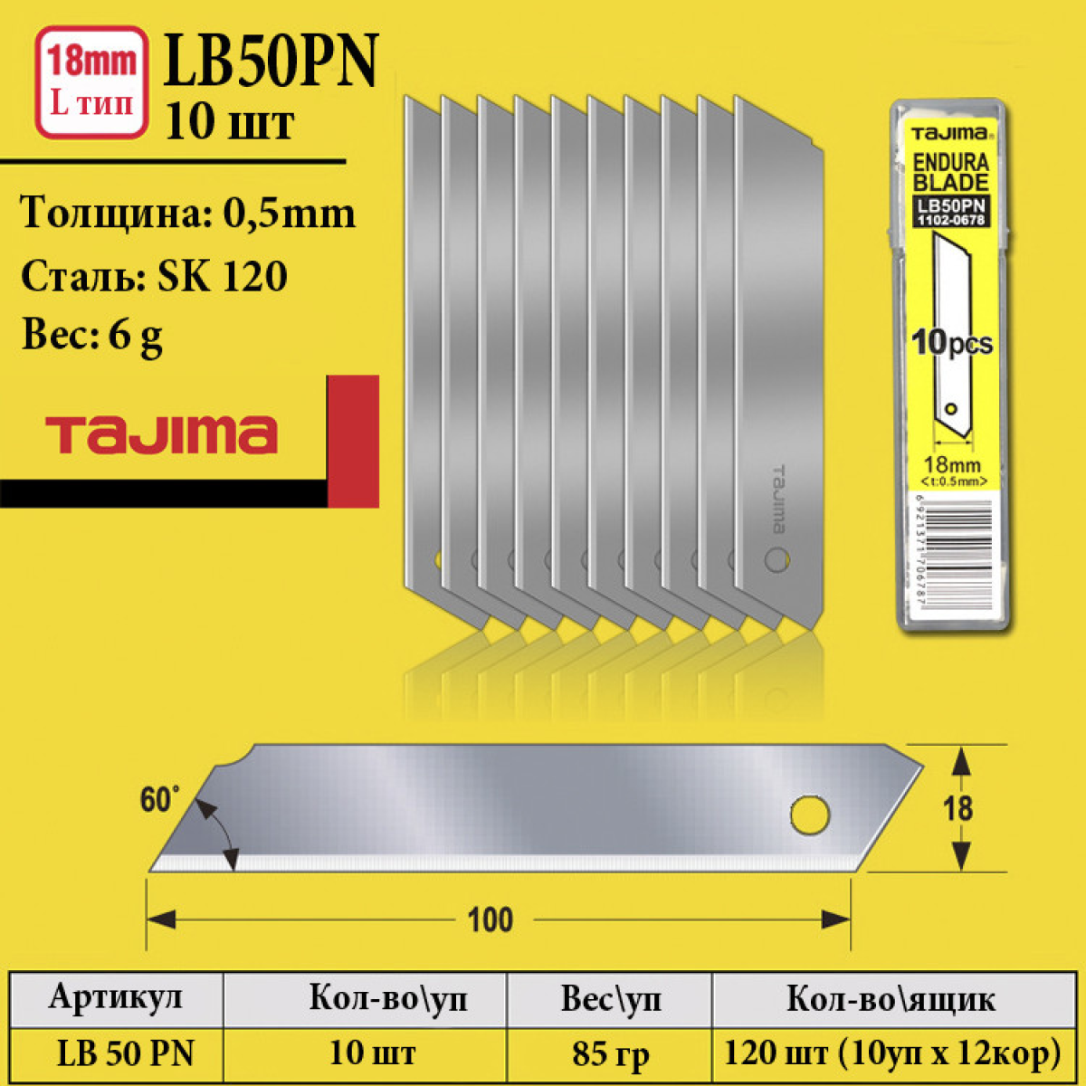 Леза для канцелярского ножа 18 мм безсегментні TAJIMA (Японія) LB50PN ультра гострі 10 шт (1102-0678)