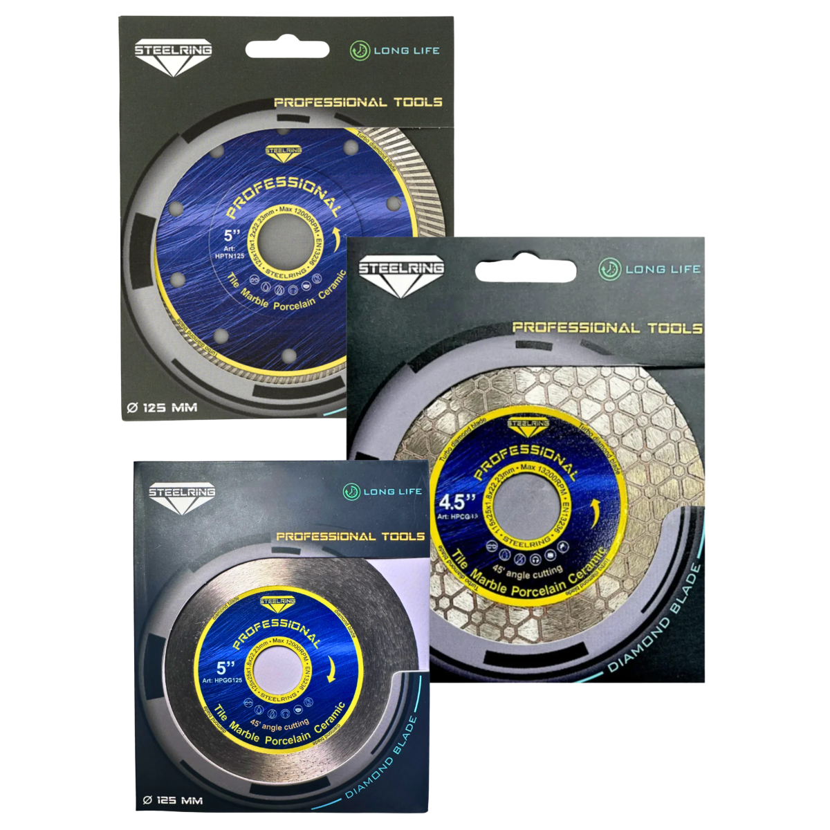 Steelring Комплект алмазних дисків Steelring Ø125 мм — це професійний набір для точного, чистого та швидкого різання керамограніту, керамічної плитки, граніту та інших твердих облицювальних матеріалів. У комплект входять три спеціалізовані алмазні диски Ø125 мм, кожен з яких виконує свою задачу — від ідеально чистого різу до професійної заусовки під 45°.
