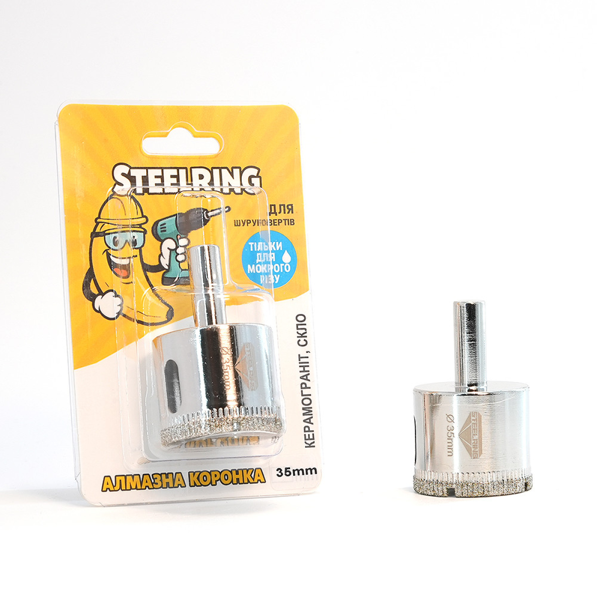 Алмазна коронка STEELRING 35 мм — професійний інструмент для точного свердління твердих облицювальних матеріалів: керамограніту, керамічної плитки, мармуру, скла та інших мінеральних поверхонь.