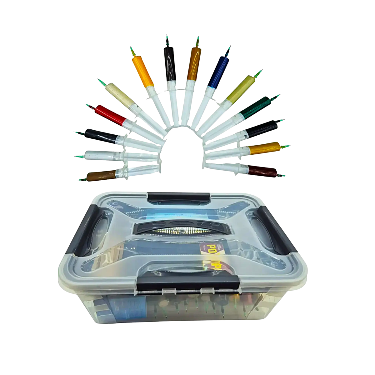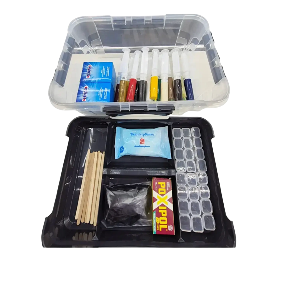 Завдяки широкому набору барвників і професійним клеям, ви зможете точно відтворити текстуру та колір поверхні, зробивши дефект практично непомітним. Це ідеальне рішення для усунення сколів, тріщин, подряпин, отворів та інших дефектів після монтажу або експлуатації.