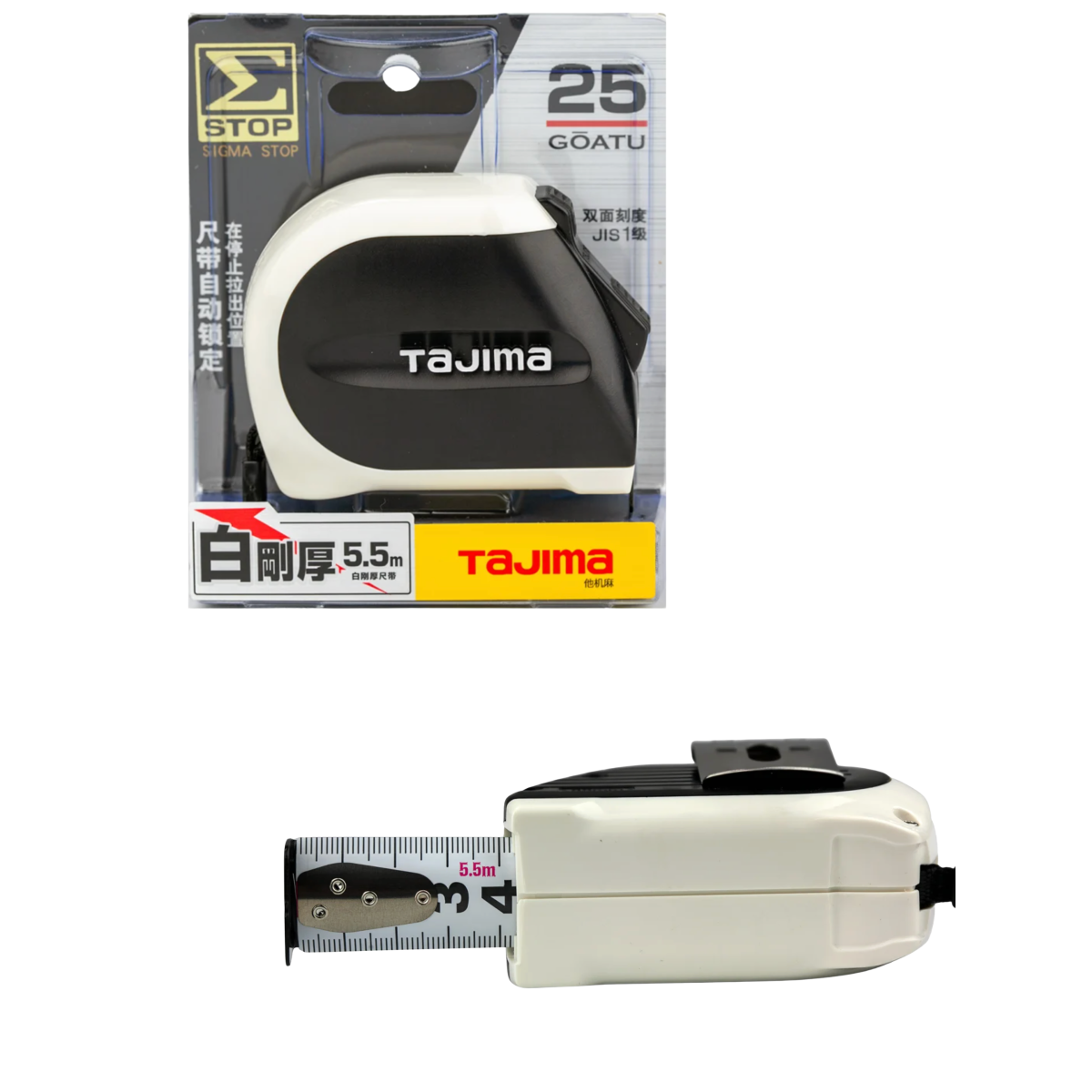 TAJIMA SIGMA SS25-55 (1001-1649) — професійна рулетка з посиленою стрічкою та автоматичним фіксатором (Auto Stop). Розроблена для інтенсивної роботи на будівельних і монтажних об’єктах, де важлива точність та стабільність вимірів.